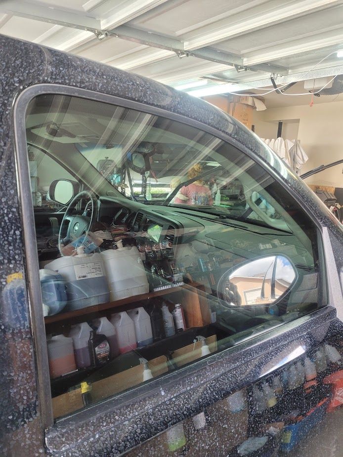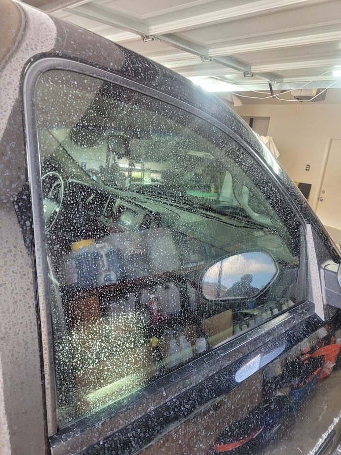 Glass polishing removes water spots, light etching, and haze to restore clarity and improve visibility. Pricing depends on severity, and all polished glass is finished with a glass-specific ceramic coating for long-lasting clarity and easier maintenance.